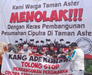 ” Di kompleks Perumahan Taman Aster RW 07 dan RW 09 warga menggelar aksi demo menolak adanya pembangunan perumahaan milik Ciputra menggunakan akses jalan perumahan. Bahkan pengembang Ciputra disinyalir belum mengantongi ijin. Jum’at (17/10/2025).